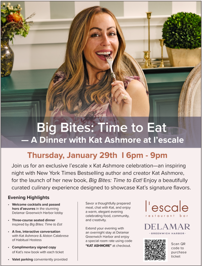 Food lovers will have a chance to dine, connect, and celebrate creativity later this month when New York Times bestselling author and content creator Kat Ashmore hosts a special evening at L’Escale at Delamar Greenwich Harbor.