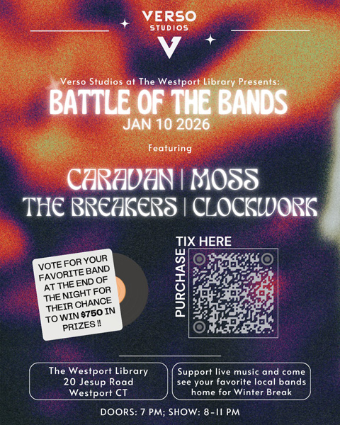 Verso Studios, the media arm of The Westport Library, created the event to amplify original music and provide a platform for young Connecticut artists. The Battle of the Bands marks a new initiative aimed at fostering local talent while strengthening connections between musicians and their communities.